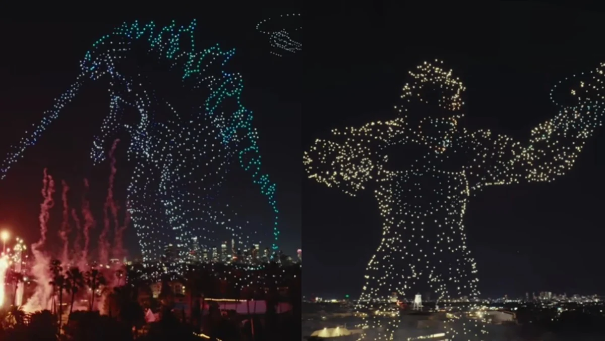O show, que durou 12 minutos, empregou um total de 3.000 drones. Essas pequenas aeronaves não tripuladas formaram figuras tridimensionais colossais, atingindo quase 150 metros de altura no céu noturno de Los Angeles.