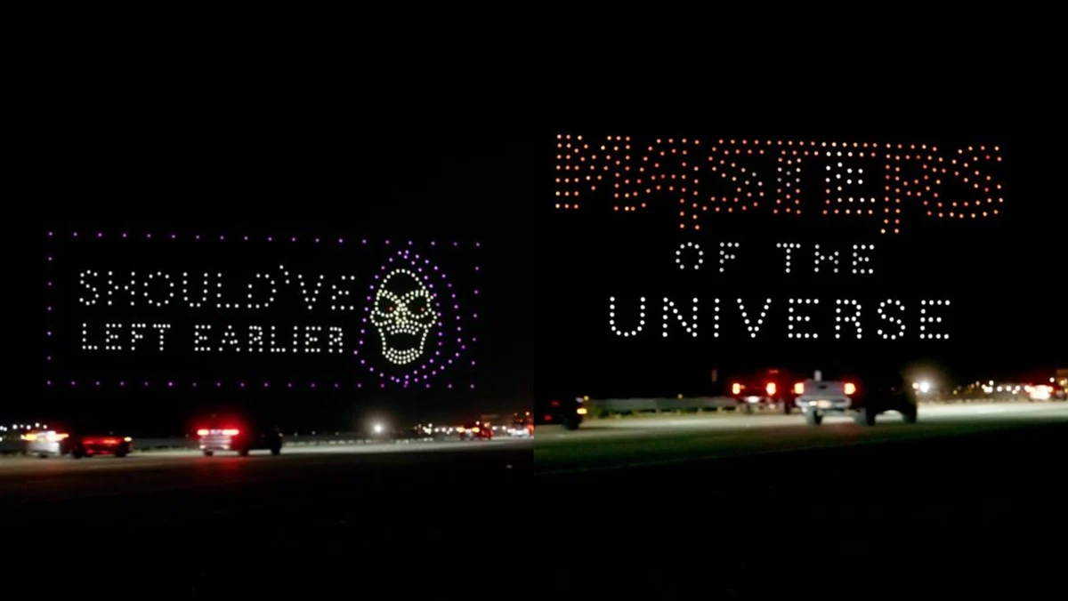 A Heads in the Sky, empresa especializada em shows de drones, orquestrou um espetáculo com 400 drones sincronizados. Estas pequenas aeronaves iluminaram o céu noturno, formando figuras e textos relacionados ao universo de Masters of the Universe. A tecnologia de drones permite a criação de espetáculos visuais impressionantes e mensagens dinâmicas, algo que marcas estão cada vez mais explorando.